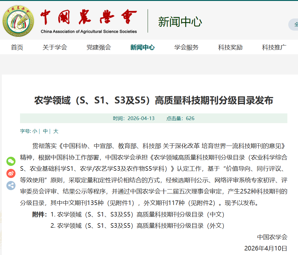 喜报 | 环保所两本期刊均入选农学领域高质量科技期刊分级目录T1级