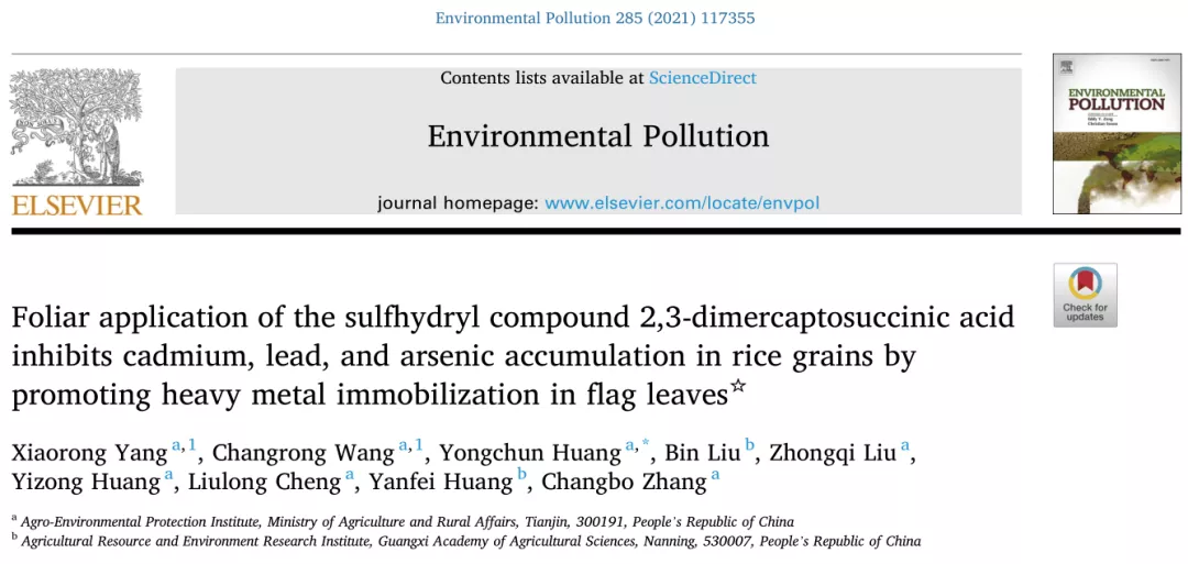 Environmental Pollution:叶面喷施巯基化合物DMSA抑制稻米中重金属镉铅砷的积累