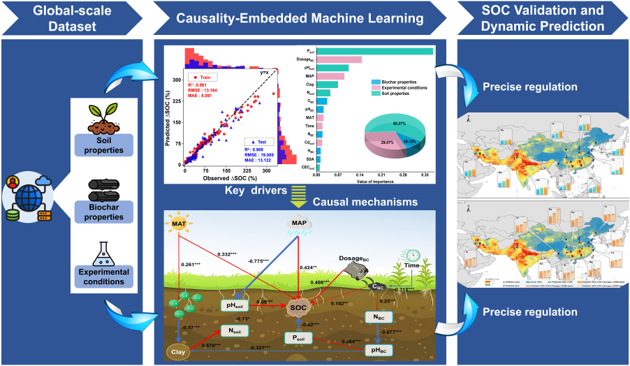 该研究构建了融合随机森林与偏最小二乘路径模型的可解释因果框架,系统解析了生物炭结构、土壤性质及环境条件等关键特征驱动有机碳动态变化的交互机制。研究发现,土壤性质(如磷含量和酸碱度)是决定生物炭固碳效果的主导因素,其影响力占比超过60%。同时,明确了镉的“阈值效应”,当土壤镉浓度超过5.8 mg/kg时,其对有机碳积累的促进作用明显减弱。并量化了土壤理化因素的交互效应(如磷竞争吸附抑制固碳)、气候因素引发的级联效应以及生物炭自身老化的反馈作用等三条关键互作路径,揭示了多因子协同调控机制。研究提出需结合区域土壤特性与镉污染程度,制定“分区分类”的生物炭精准修复方案。该成果为镉污染土壤修复与地力提升协同增效提供了理论支撑。
