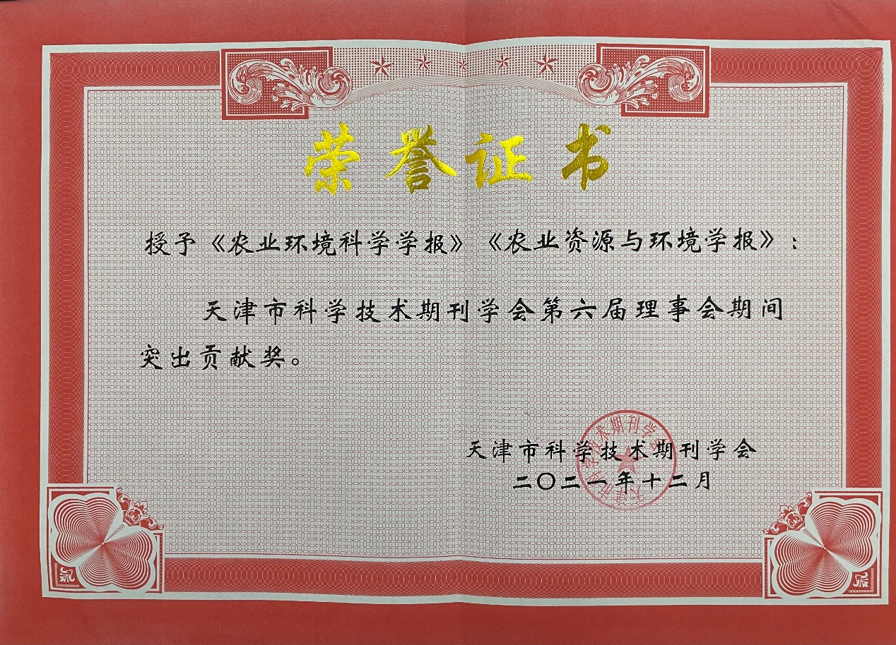 3月15日,从天津市科技期刊学会理事换届大会获悉,环保所主办的《农业环境科学学报》《农业资源与环境学报》两本期刊被天津市科技期刊学会第六届理事会授予突出贡献奖。
