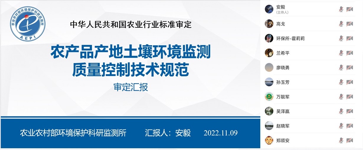 2022年11月9日,受农业农村部科技教育司委托,农业农村部农业资源环境标准化技术委员会组织有关专家,以视频会议的形式线上召开了农业行业标准《农产品产地土壤环境监测质控规范》审定会,本标准由我所产地环境监测与预警创新团队牵头制定