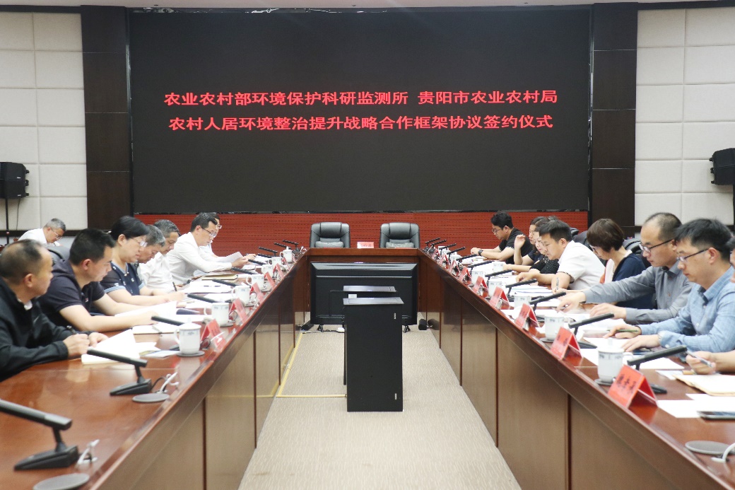 贵州省农业农村厅党组成员、副厅长方涛肯定了环保所在科技支撑贵州省农业农村绿色发展和生态环境保护等方面的工作成效;贵阳市副市长冉斌对环保所在贵阳贵安农村“五治”工作方面给予的支持表示感谢。环保所与贵阳市农业农村局签署人居环境整治提升战略合作协议,下一步将围绕农村人居环境整治关键核心技术协同攻关、研学基地建设、打造综合示范点、科技成果转化等方面开展深入合作。