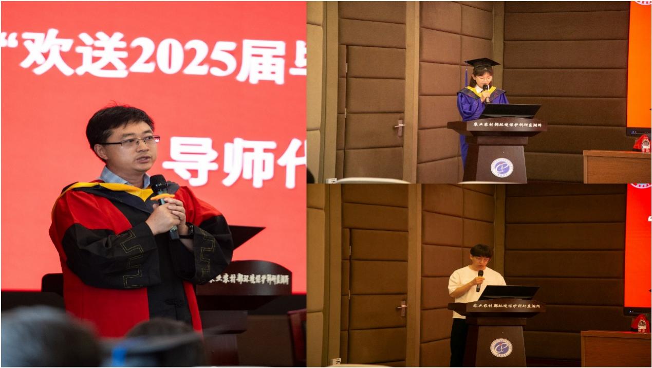 典礼在庄严的国歌声中拉开序幕。环保所所长、党委副书记熊明民发表毕业致辞,向圆满完成学业的全体研究生表示祝贺,向辛勤培育学生的导师表示感谢。他寄语毕业生要始终保持初心与热情,坚定信念、勇往直前,在各自岗位上发光发热,把青春写进时代的华章。导师代表申锋老师向毕业生表达祝福,毕业生代表伏薇霖、在校生代表武世航分别发言,传递了感恩与传承的力量。