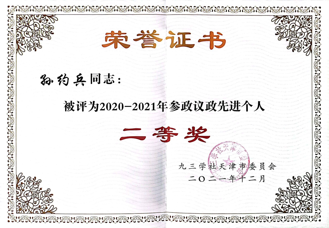 环保所孙约兵研究员荣获九三学社天津市委2020-2021年度参政议政工作先进个人二等奖