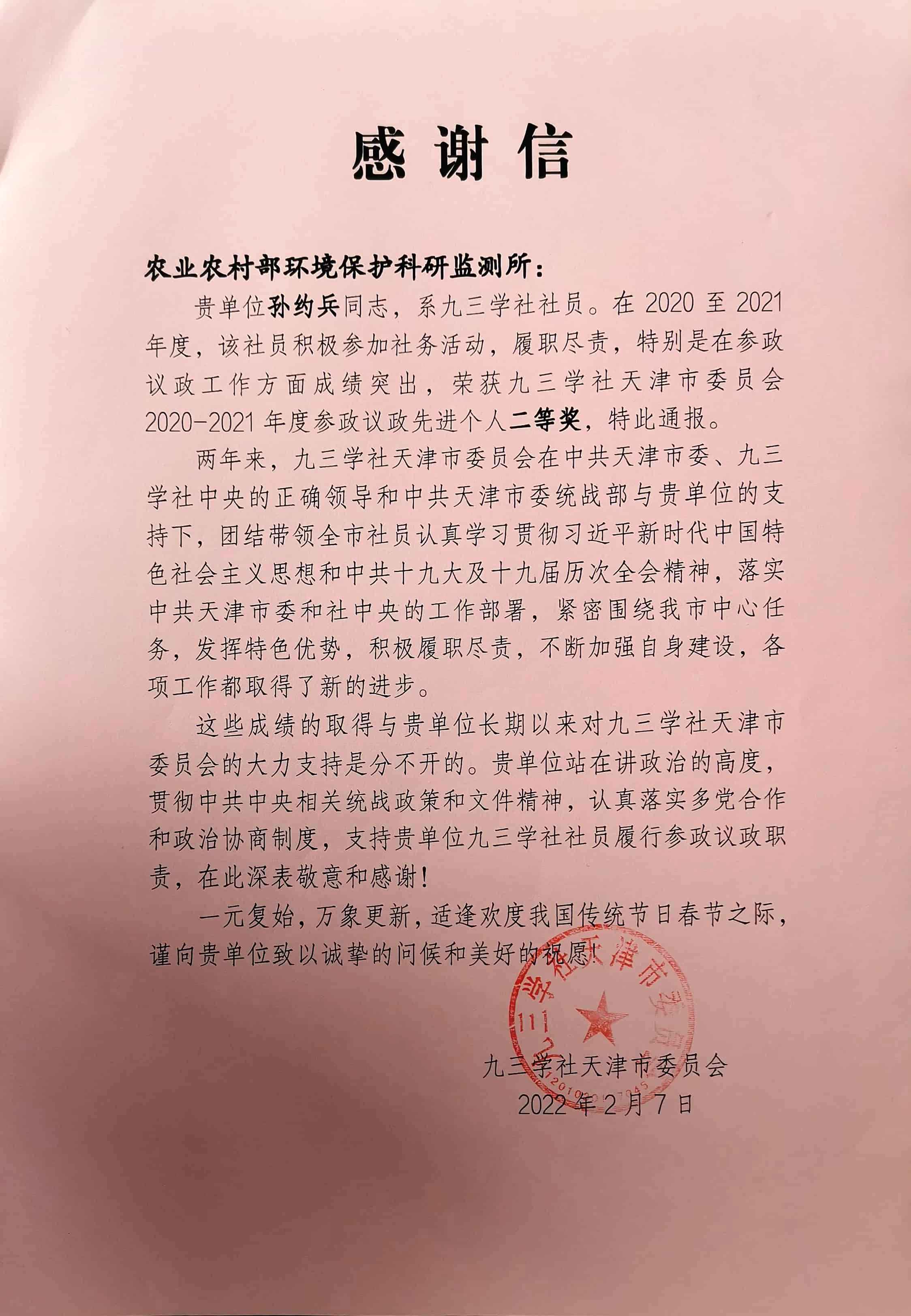 近日,九三学社天津市委对2020-2021年期间在参政议政方面履职取得突出成绩、做出突出贡献的先进集体和个人进行表彰,并向农业农村部环境保护科研监测所致感谢信。环保所孙约兵研究员荣获九三学社天津市委2020-2021年度参政议政工作先进个人二等奖。