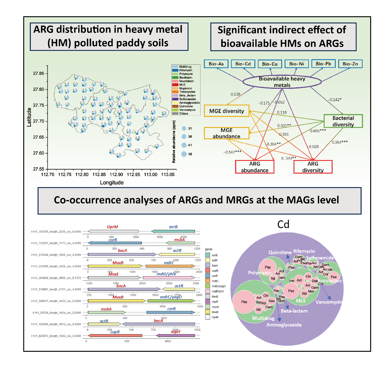 农田重金属污染对土壤中抗生素耐药基因的出现和维持起到促进作用。然而,不同种类和形态重金属对稻田土壤中抗生素耐药基因分布影响的差异特征及其影响机制尚不清楚。