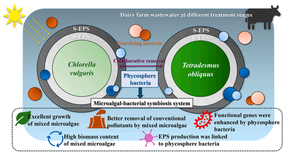 近日,农业农村部环境保护科研监测所养殖业污染防治创新团队研究揭示了奶牛场废水处理过程中混合微藻与藻际细菌的作用关系,相关研究成果发表在《生物资源技术(Bioresource Technology)》上。