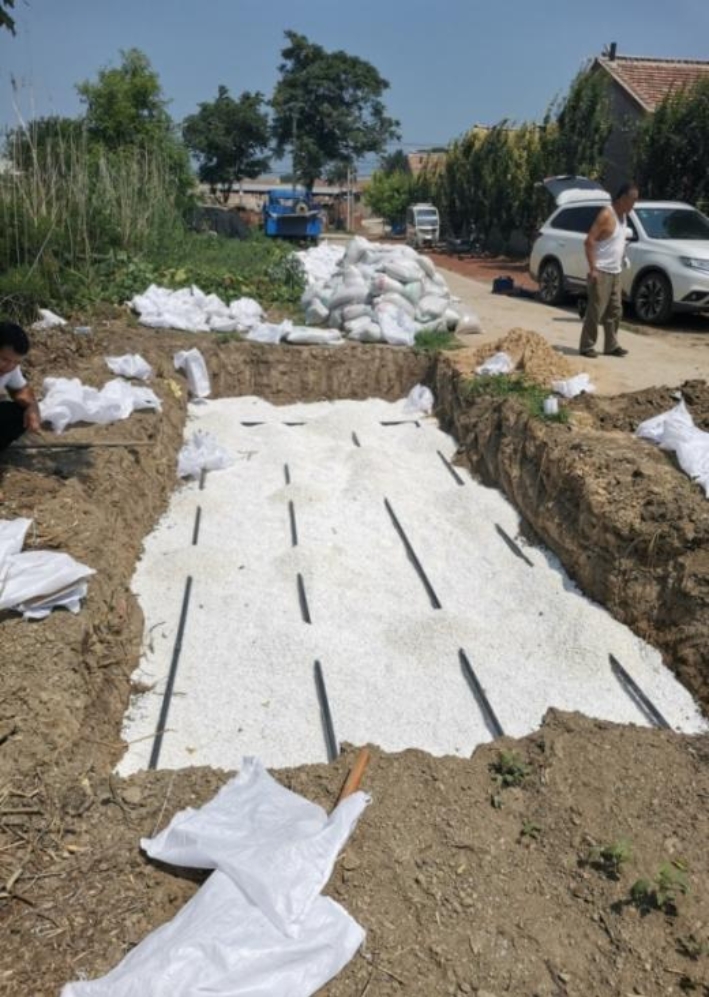 “农村散户黑灰水土壤渗滤系统”主要是采用“化粪池+土地处理系统+小菜园/小果园/小花园”模式,根据农户的习惯,在化粪池末端接入地下布水管道,引入渗滤床式土地处理系统,实现农户化粪池出水就地利用,土地处理系统上方的地表部分构建庭院小菜园/小果园/小花园,利用种植作物进一步吸收土壤渗滤系统中的氮磷养分。