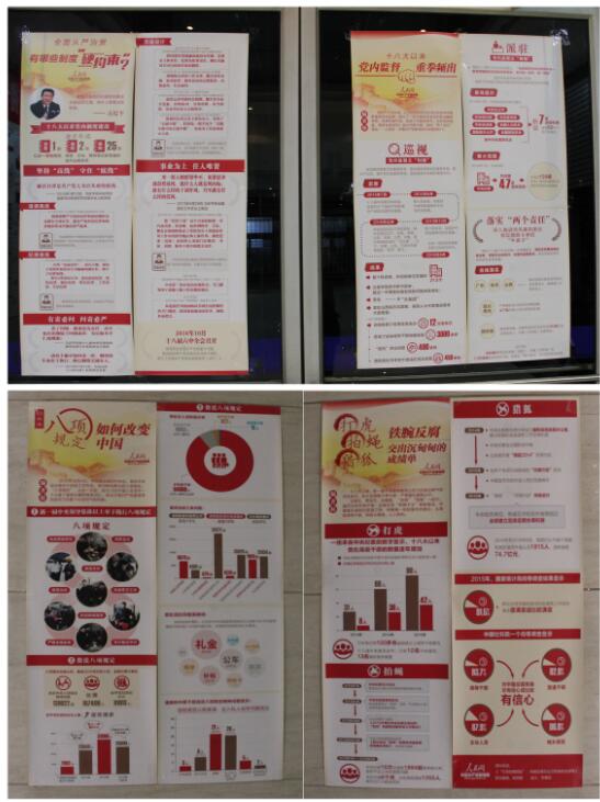 宣传内容共分为“解读十八届六中全会精神”“重温长征路、续写新篇章”和“开创全面从严治党新局面”三个专题,共32幅图片。“解读十八届六中全会精神”专题,围绕“全面从严治党”一个主题和“严肃党内政治生活”“加强党内监督”两大内容,全面梳理并解读了全会公报、习近平总书记重要讲话,以及新出台的《关于新形势下党内政治生活的若干准则》和《中国共产党党内监督条例》(以下简称“《准则》和《条例》”)等内容与精神,进一步回顾总结了《准则》和《条例》两个制度之笼的完善过程,以及“四个全面”战略布局的整体设计过程,并依据全会内容精神提炼出了“1个不做”“2个不得”“6个禁止”“6个不准”“7个不能”“8个不允许”等党员领导干部禁止事项,深入宣传全会精神和新形势下加强和规范党内政治生活、加强党内监督的重大意义、目标原则、任务举措。
