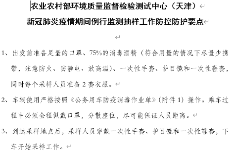 严格落实我院、我所关于疫情防控和人员返岗要求,在取得批准的基础上,组织制定了《新冠肺炎疫情期间例行监测抽样工作防控防护要点》《新冠肺炎疫情期间实验室开展检测活动的防控防护细化方案》,建立健全重点环节和检测过程防控管理制度,强化防控措施落实落地,做到具体工作责任到人、重点环节责任到人,监督落实责任到人,确保检测过程防控全覆盖、无死角,全力保障人员安全的前提下努力为疫情期间农产品质量安全工作做好科技支撑。