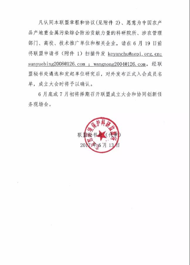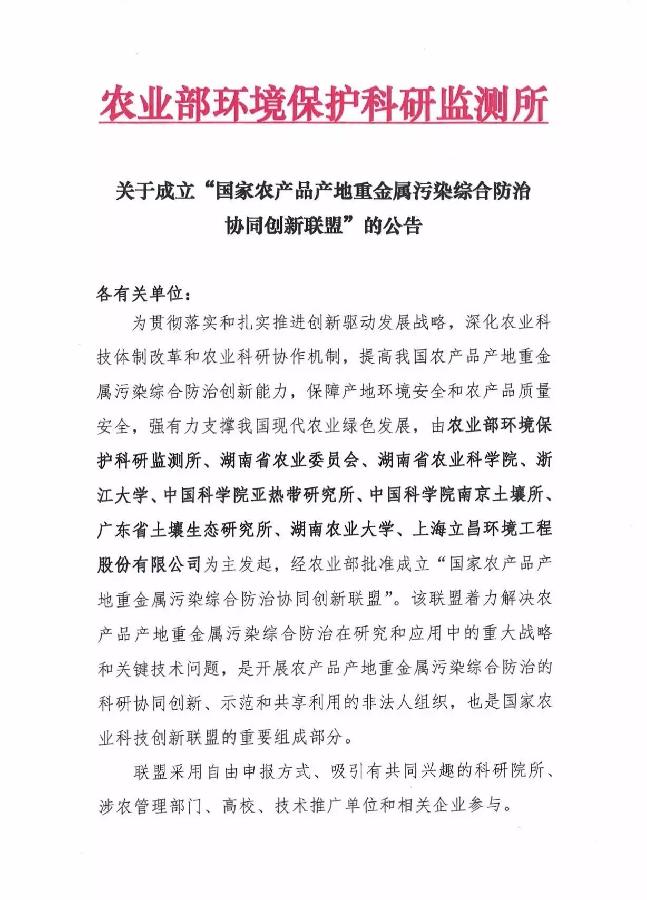 关于国家农产品产地重金属污染综合防治协同创新联盟成立公告