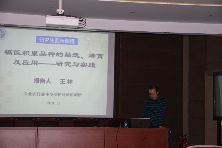 2019年11月1日下午,环保所研究生回所课程第六讲在学术报告厅举行,产地环境监测与预警创新团队赵玉杰研究员、养殖业污染防治创新团队杜连柱研究员、农田重金属污染修复创新团队王林副研究员分别做题为农业环境风险评估,我国沼气工程现状及发展趋势和镉低积累品种的筛选、培育及应用的报告。环保所全体博士、硕士研究生参与了此次课程讲座。