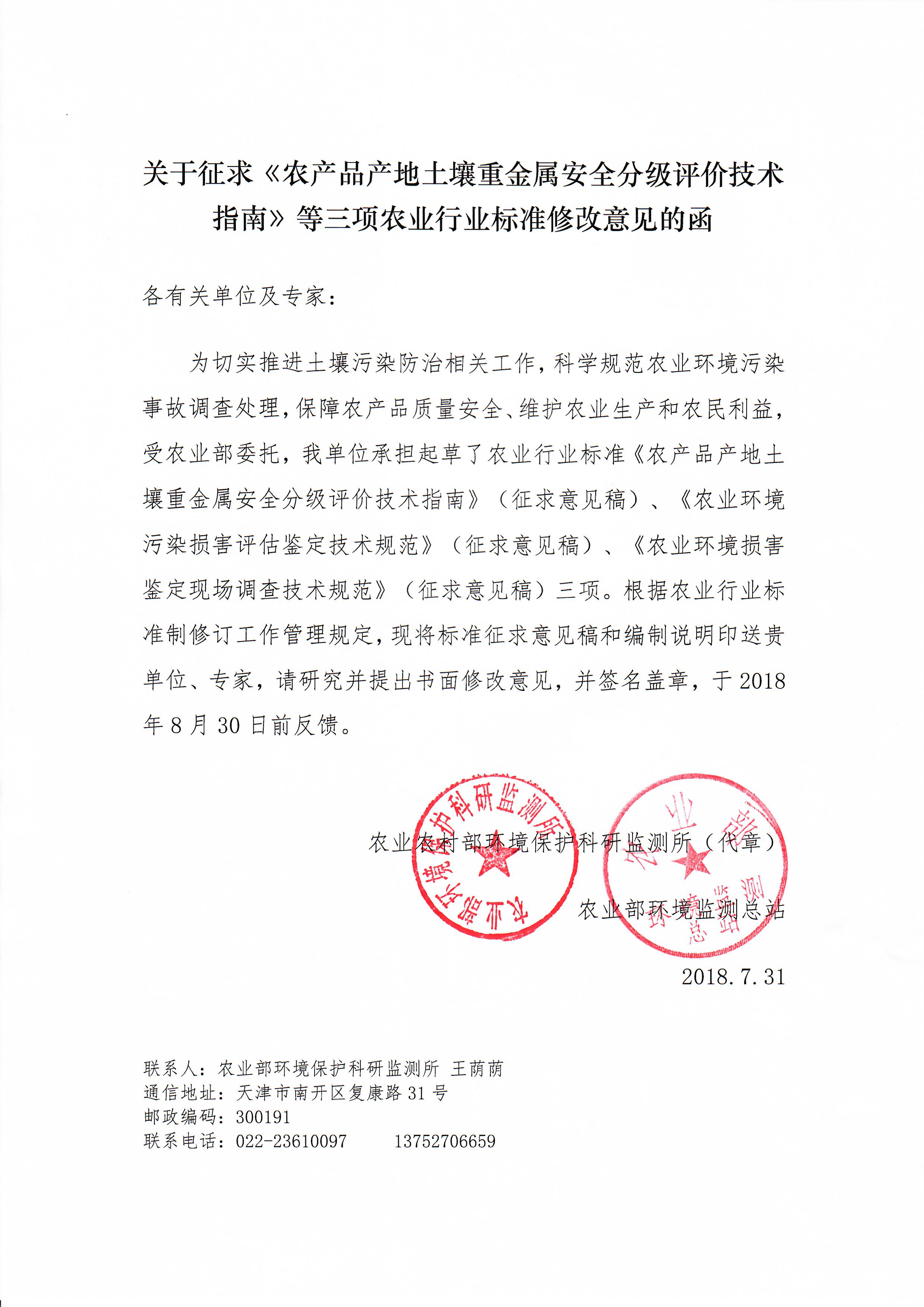当前位置: 首页» 新闻中心» 通知公告 关于征求《农产品产地土壤重金属安全分级评价技术指南》等三项农业行业标准修改意见的函 作者: 来源: 2018-08-14 相关附件 1.《农业环境损害鉴定现场调查技术规范》(征求意见稿).docx 1.《农业环境损害鉴定现场调查技术规范》编制说明.docx 2. 《农业环境污染损害评估鉴定技术规范》(征求意见稿).doc 2. 农业环境污染损害评估鉴定技术规范(编制说明).docx 3. 《农产品产地土壤重金属安全分级评价技术指南》(征求意见稿).docx 3. 《农产品产地土壤重金属安全分级评价技术指南》编制说明.docx 标准征求意见表—1. 农业环境损害鉴定现场调查技术规范.doc 标准征求意见表—2. 农业环境污染损害评估鉴定技术规范.doc 标准征求意见表—3. 农产品产地土壤重金属安全分级评价技术指南.doc