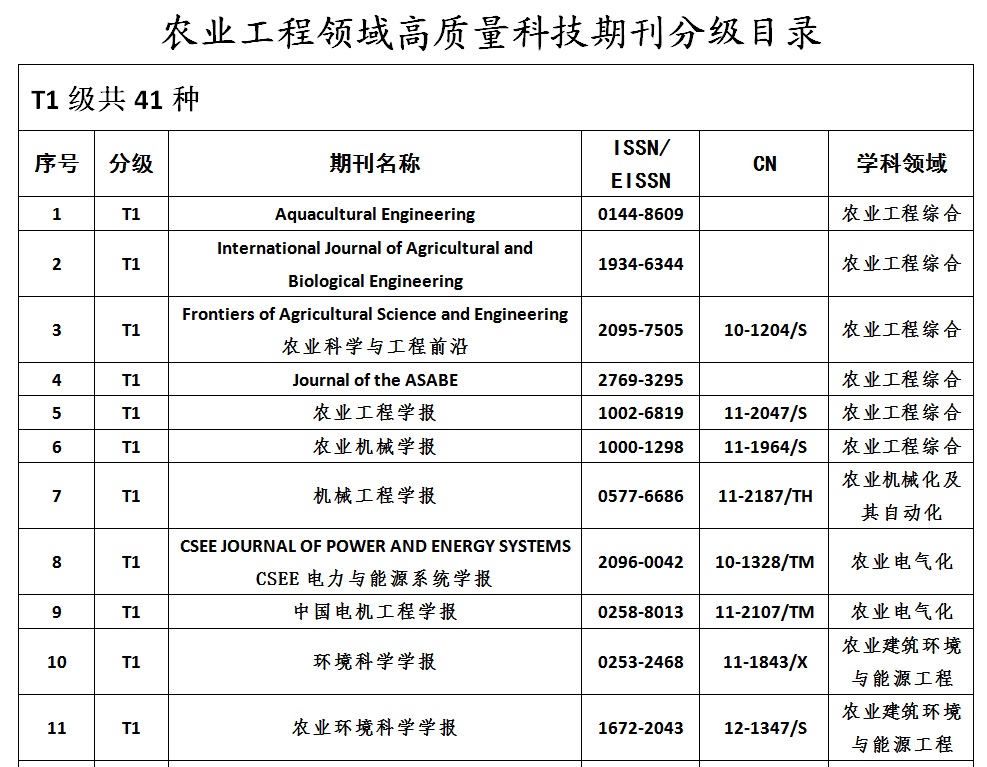 为加快推进世界一流科技期刊建设,推动建设中外期刊同质等效的评价体系,在中国科学技术协会的统一部署下,中国农业工程学会以“同行评议、价值导向、等效使用”为原则,采取定量评价与定性评价相结合的方式,开展了农业工程领域分级目录的评审、认定和发布工作,先后经过期刊征集、指标构建、专家初评、审定终评、结果公示、优化调整等多个环节。本次共有194种期刊进入分级目录,其中T1级期刊41种,T2级期刊66种,T3级期刊87种。