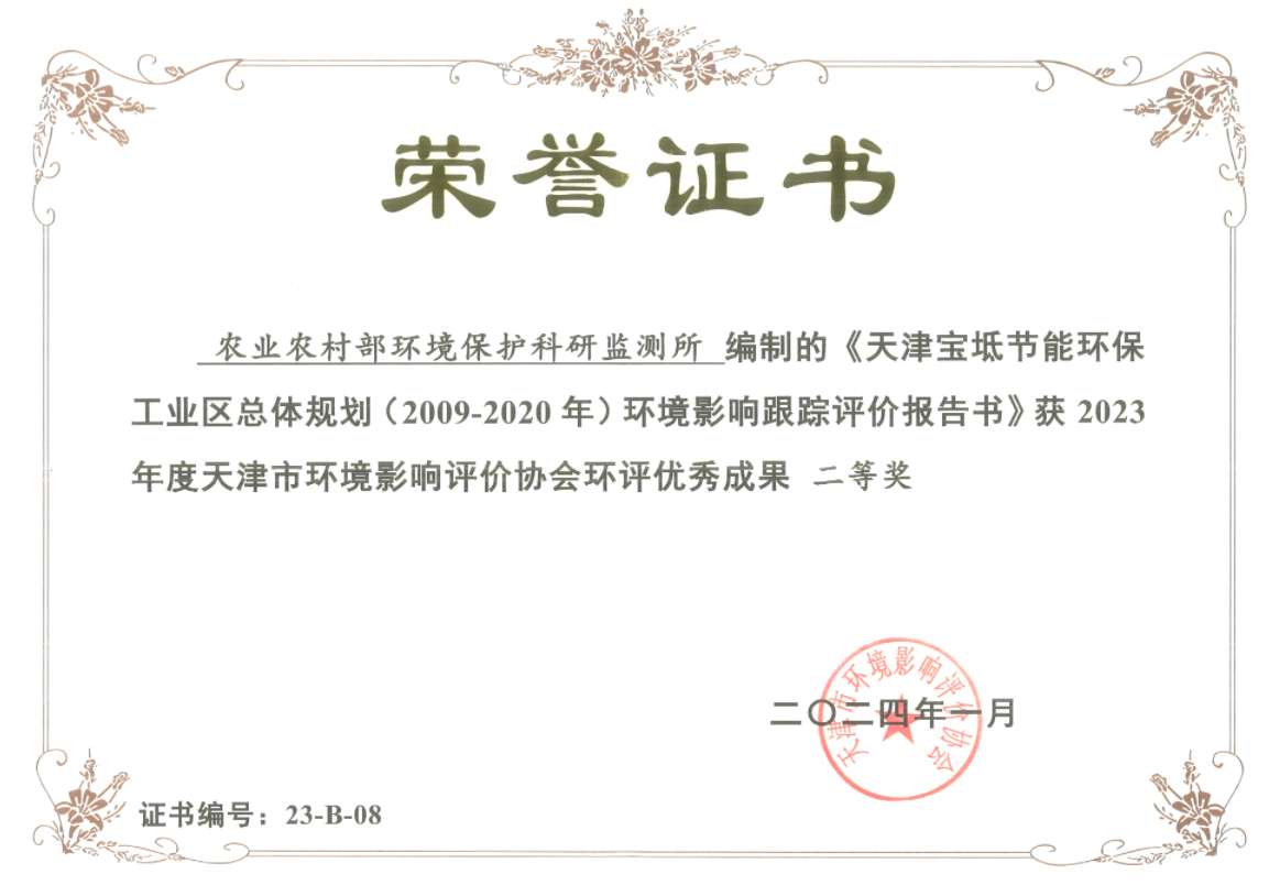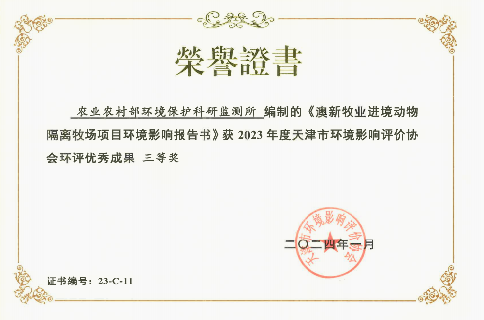 近日,在天津市环境影响评价协会组织开展的“2023年度环评文件优秀成果评选活动”中,环保所主持编制的《天津宝坻节能环保工业区总体规划(2009-2020年)环境影响跟踪评价报告书》、《澳新牧业进境动物隔离牧场项目环境影响报告书》分别荣获二、三等奖。