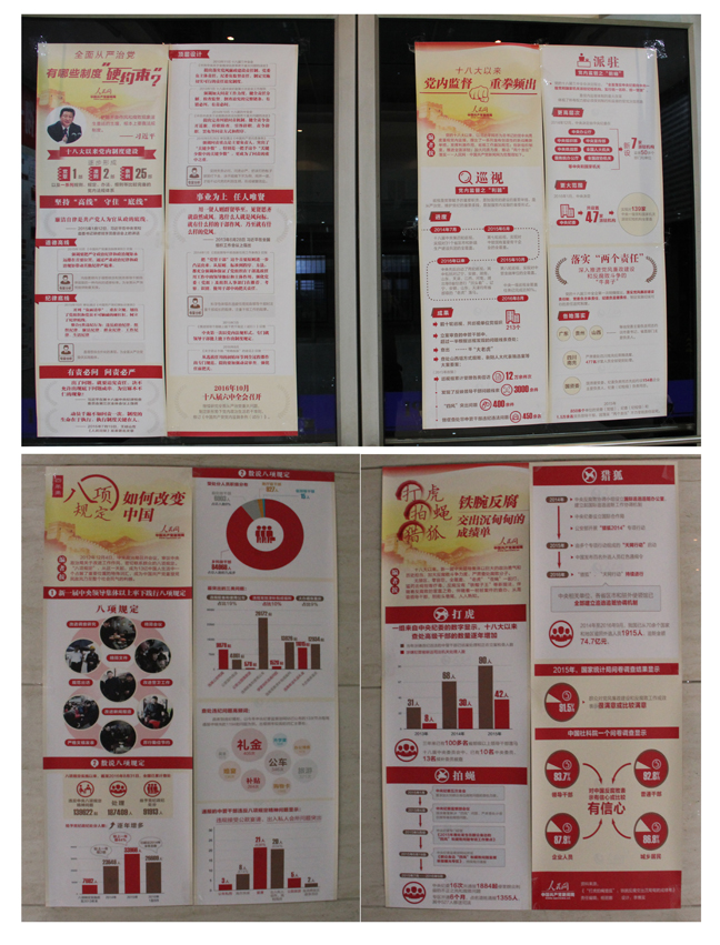 宣传内容共分为“解读十八届六中全会精神”“重温长征路、续写新篇章”和“开创全面从严治党新局面”三个专题,共32幅图片。“解读十八届六中全会精神”专题,围绕“全面从严治党”一个主题和“严肃党内政治生活”“加强党内监督”两大内容,全面梳理并解读了全会公报、习近平总书记重要讲话,以及新出台的《关于新形势下党内政治生活的若干准则》和《中国共产党党内监督条例》(以下简称“《准则》和《条例》”)等内容与精神,进一步回顾总结了《准则》和《条例》两个制度之笼的完善过程,以及“四个全面”战略布局的整体设计过程,并依据全会内容精神提炼出了“1个不做”“2个不得”“6个禁止”“6个不准”“7个不能”“8个不允许”等党员领导干部禁止事项,深入宣传全会精神和新形势下加强和规范党内政治生活、加强党内监督的重大意义、目标原则、任务举措。