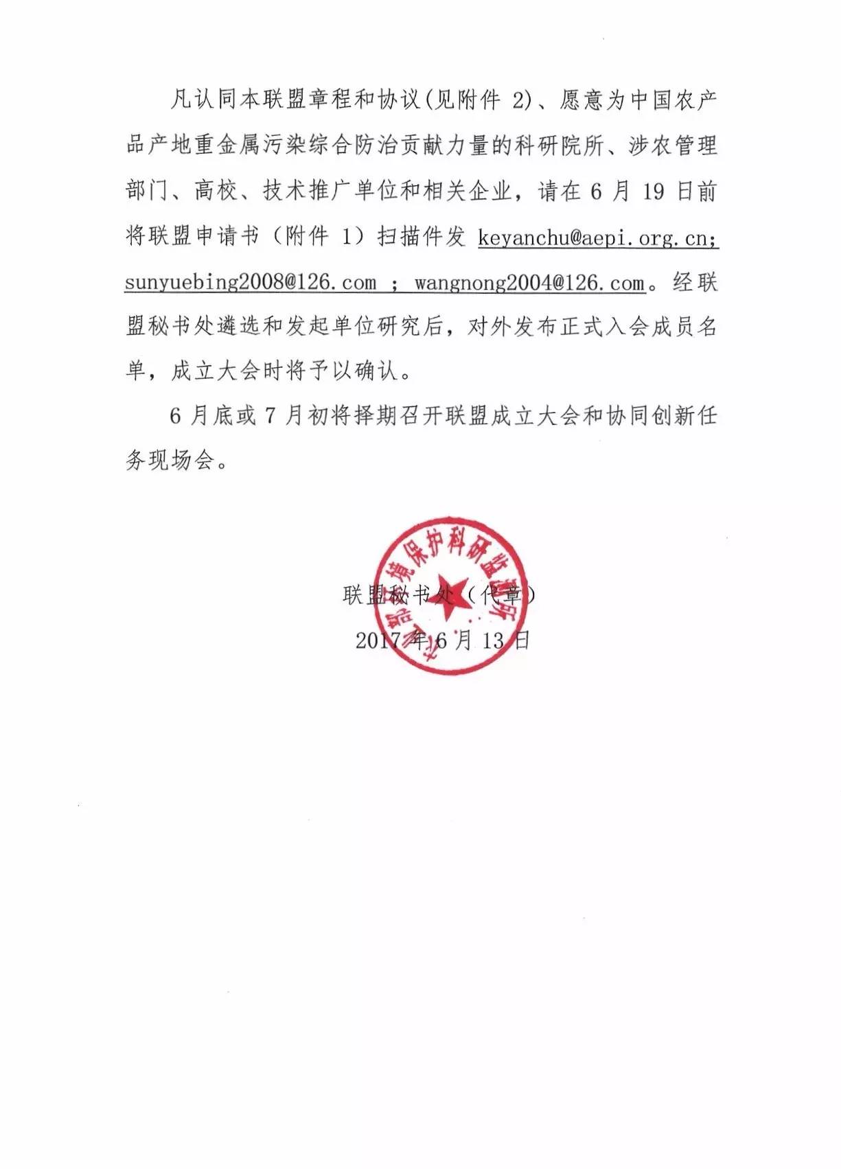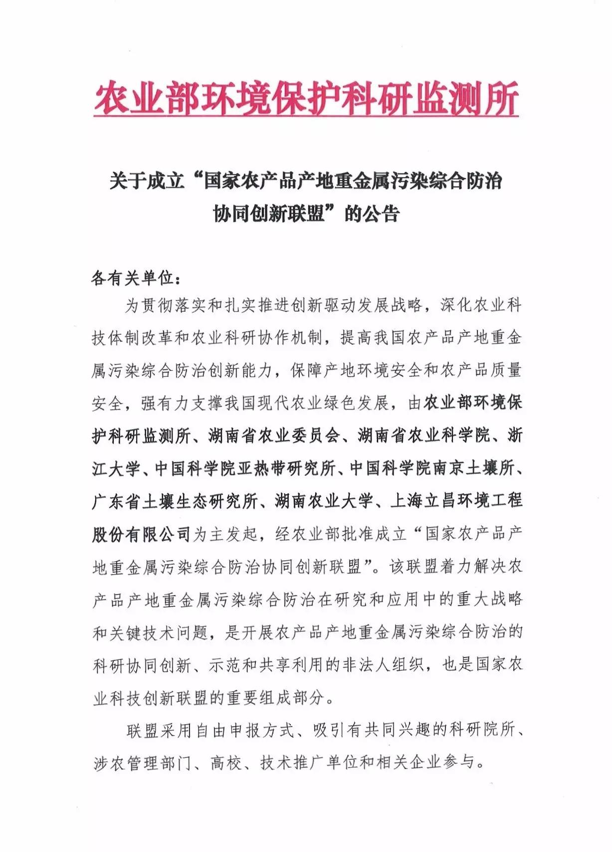 关于国家农产品产地重金属污染综合防治协同创新联盟成立公告