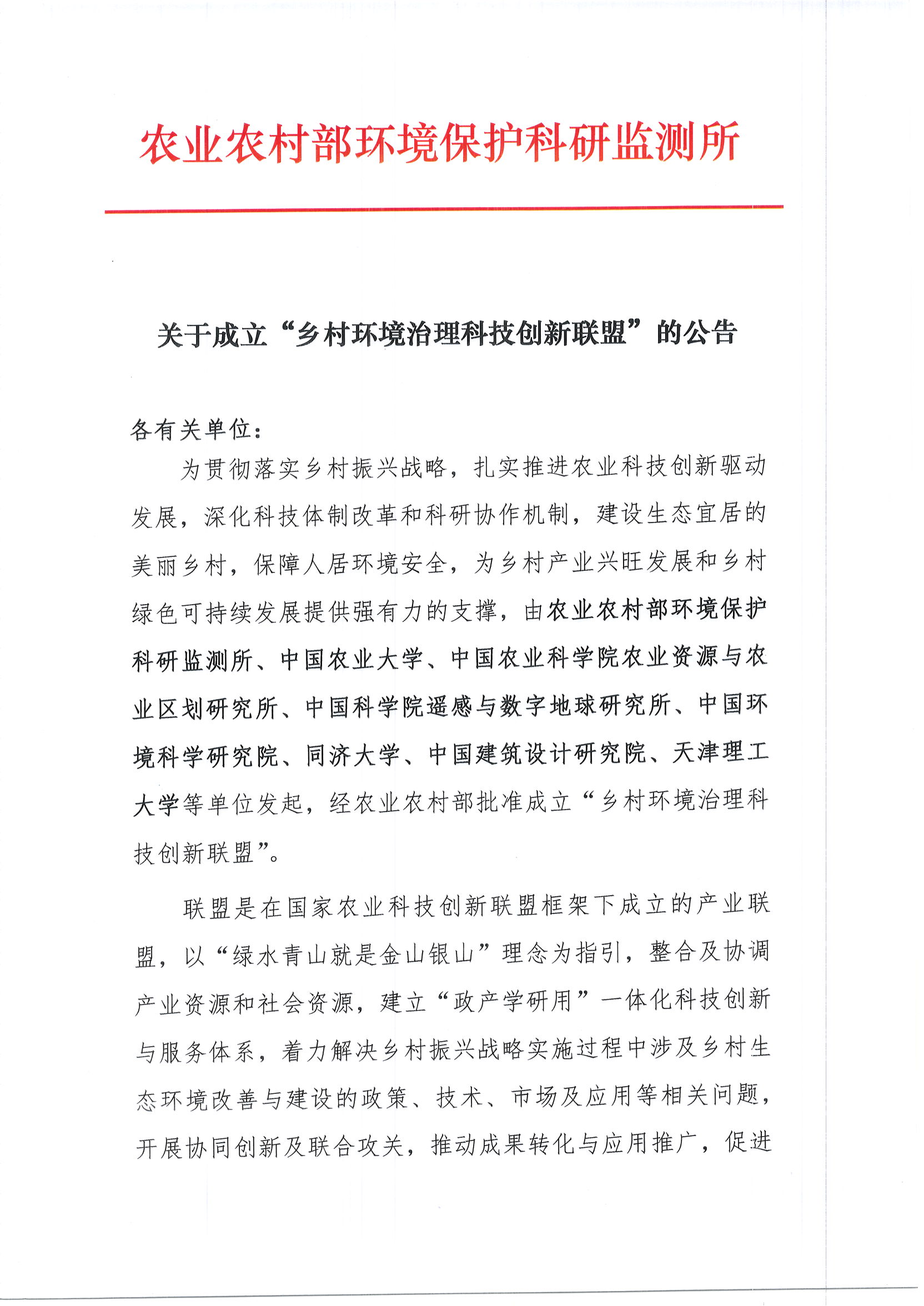 为贯彻落实乡村振兴战略,扎实推进农业科技创新驱动发展,深化科技体制改革和科研协作机制,建设生态宜居的美丽乡村,保障人居环境安全,为乡村产业兴旺发展和乡村绿色可持续发展提供强有力的支撑,由农业农村部环境保护科研监测所、中国农业大学、中国农业科学院农业资源与农业区划研究所、中国科学院遥感与数字地球研究所、中国环境科学研究院、同济大学、中国建筑设计研究院、天津理工大学等单位发起,经农业农村部批准成立“乡村环境治理科技创新联盟”。