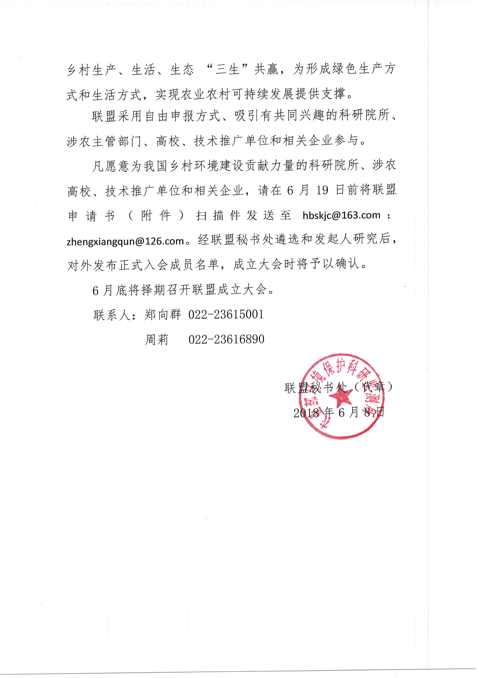 凡愿意为我国乡村环境建设贡献力量的科研院所、涉农高校、技术推广单位和相关企业,请在6月19日前将联盟申请书(附件)扫描件发送至hbskjc@163.com;zhengxiangqun@126.com。经联盟秘书处遴选和发起人研究后,对外发布正式入会成员名单,成立大会时将予以确认。