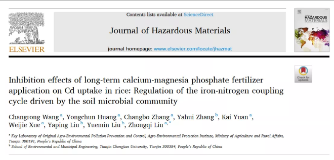 Journal of Hazardous Materials:钙镁磷肥抑制水稻镉吸收的微生物学机制