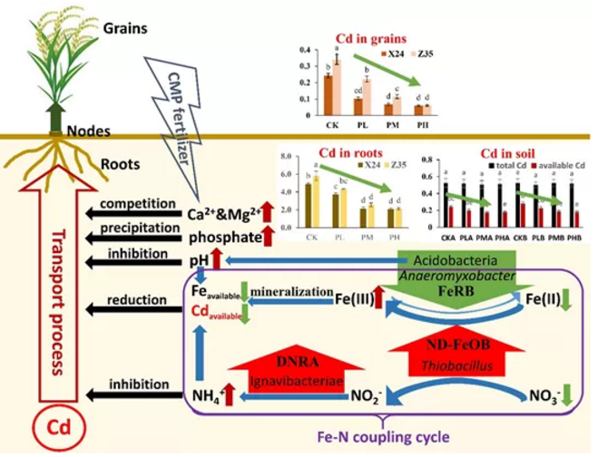进一步通过土壤微生物测序证明,施加钙镁磷肥能够改变水稻根际菌群结构及其驱动的铁-氮元素循环过程。其中,铁还原菌Anaeromyxobacter丰度的降低(3.09% ~ 2.23%),抑制了其驱动的铁还原过程;而硝酸盐依赖的铁氧化菌Thiobacillus丰度的提高(1.60% ~ 2.83%),促进了其驱动的铁氧化耦合硝酸盐还原反应,Thiobacillus以硝酸盐为电子受体,在将二价铁氧化为三价铁的同时能够将硝态氮还原成亚硝态氮;进一步,Ignavibacteriae丰度的提高(1.01% ~ 1.92%),也促进了其驱动的硝酸盐异化还原为铵(DNRA)过程的第二步反应,即亚硝酸盐异化还原为铵。也就是说,与传统的氮磷钾肥相比,施用钙镁磷肥能够通过提高水稻根际土壤中关键菌Thiobacillus和Ignavibacteriae的丰度,促进DNRA过程将硝态氮异化还原为铵态氮,而已有研究证明铵态氮能够抑制水稻根对镉的吸收;同时,与硝酸盐还原耦合的铁氧化过程也因铁氧化菌Thiobacillus和铁还原菌Anaeromyxobacter的丰度变化而得到促进,在铁氧化过程中,其矿化不但降低了有效态铁的含量,还能够通过吸附和共沉淀等作用影响镉的生物可利用性。