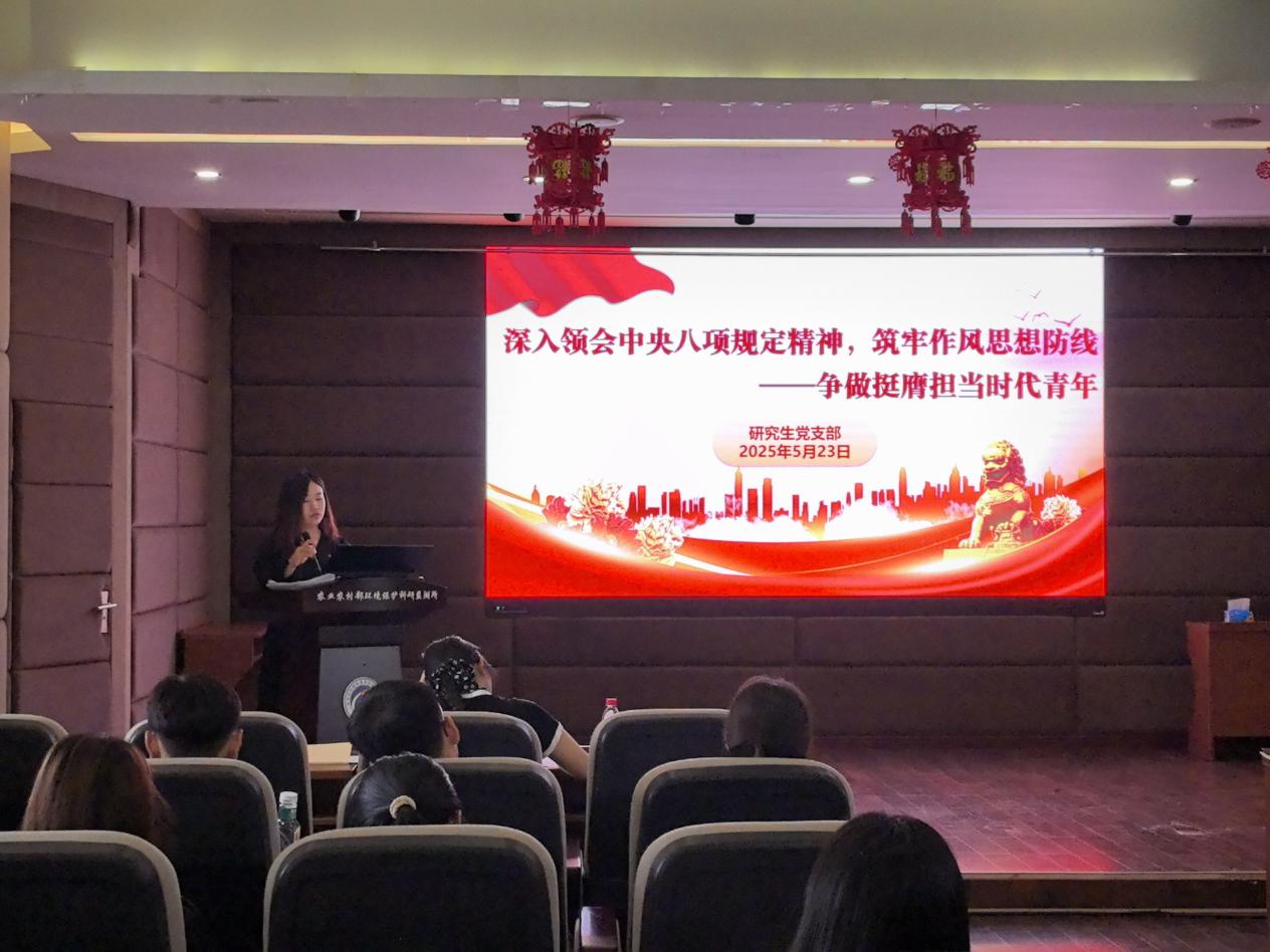 为推动深入贯彻中央八项规定精神学习教育走深走实,5月23日,环保所研究生党支部召开深入贯彻中央八项规定精神学习教育专题党课暨党支部主题党日活动。支部全体党员参加。