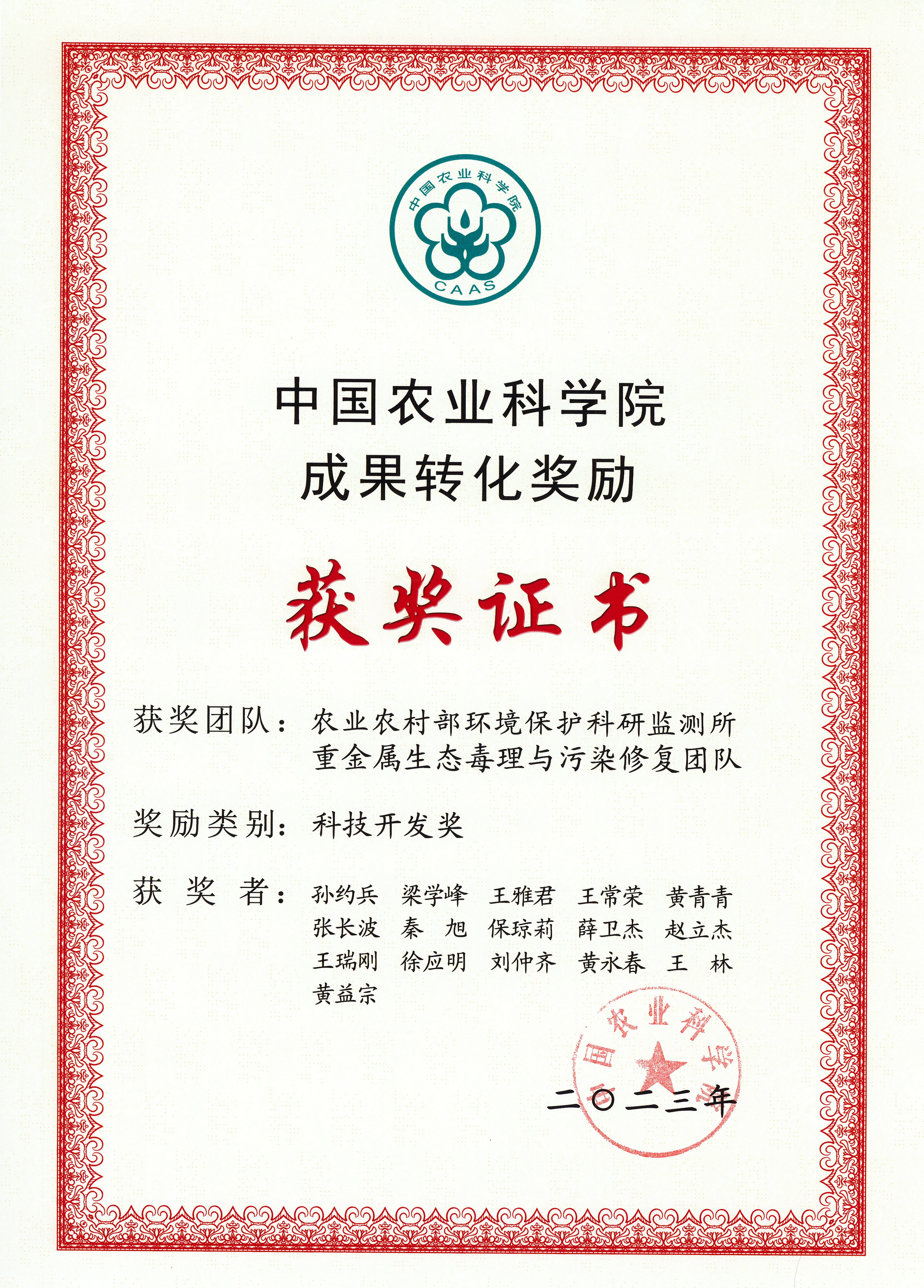 近日,2023年度中国农业科学院成果转化奖名单揭晓,环保所重金属生态毒理与污染修复创新团队获院成果转化奖-科技开发奖,并获中国农业科学院-大北农三创协同奖励。
