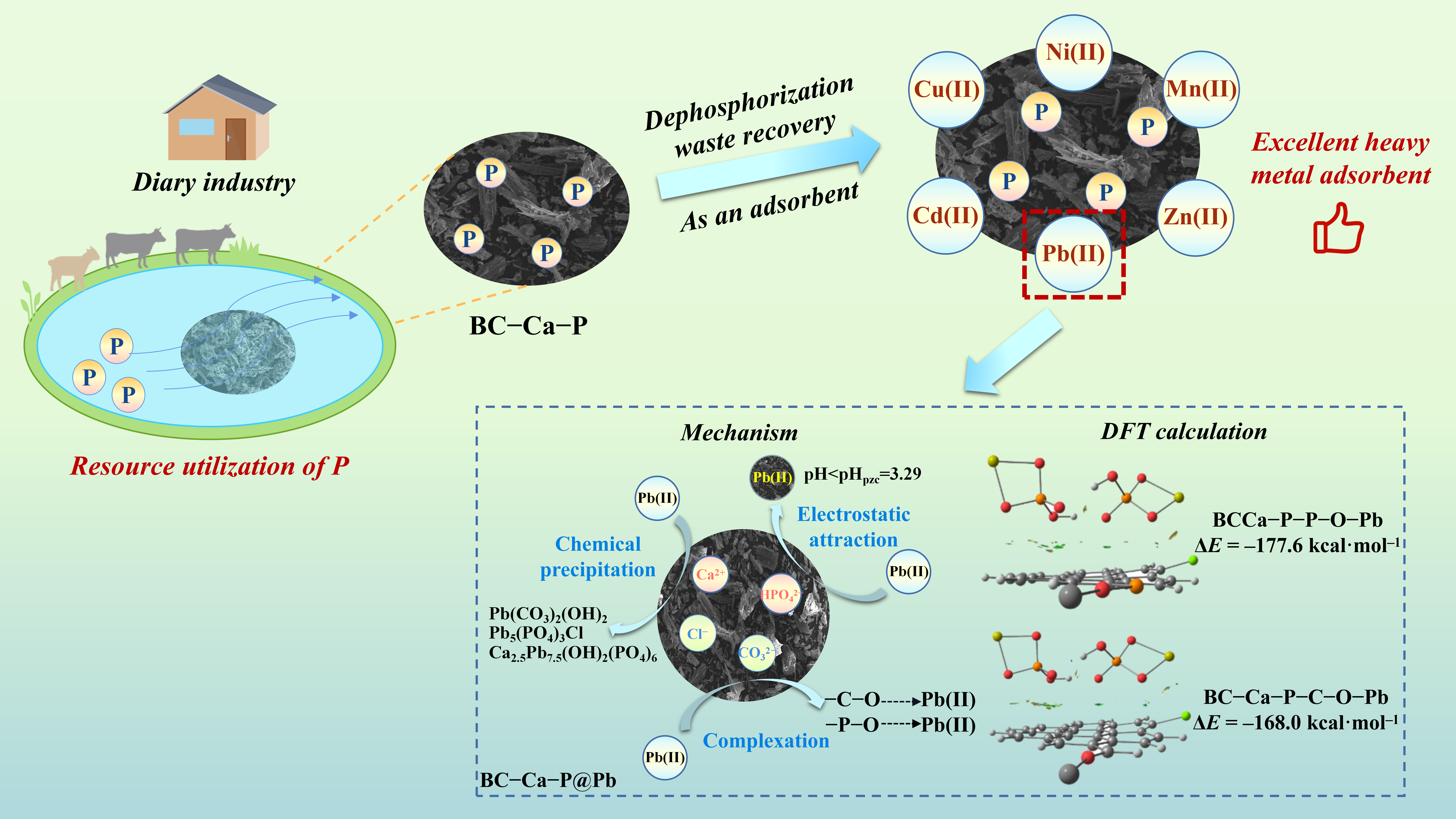 该研究提出整合生物炭生产、磷废水处理、脱磷废弃物回收和重金属去除的新策略。结果表明,生物炭脱磷废弃物能够直接用于去除废水中的重金属。钙改性生物炭处理含磷废水后回收的废弃物(BC-Ca-P)对多种重金属离子具有良好的吸附能力。在pH =5.0的条件下,BC-Ca-P2小时可达到吸附平衡并获得361.20 mg·g−1的最大吸附能力,且磷浸出浓度远低于中国城镇污水处理厂排放一级A标准。生物炭表面的P-OC-O官能团在吸附重金属离子的过程中贡献更大。该研究显著降低了材料获取成本,实现了磷资源的循环利用,并有效解决了磷的二次污染问题。本研究对生物炭脱磷废弃物的回收和再利用,以及对重金属污染控制、资源利用和环境保护具有重要意义。