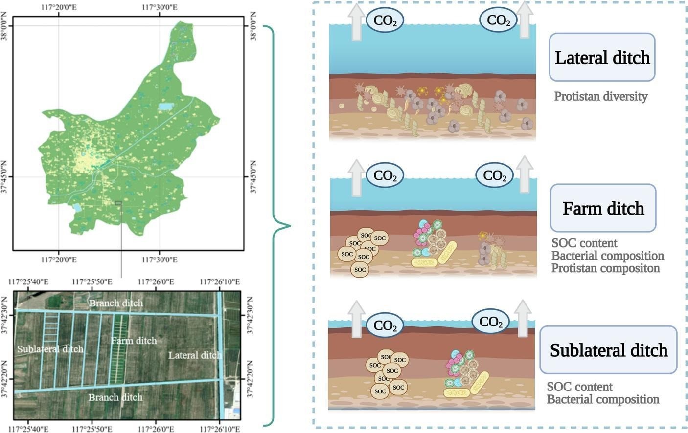 该研究通过调查评估不同等级沟渠(斗渠、农渠、毛渠)中碳动态(碳组分和碳排放)及其与细菌和原生生物群落的特征和互作关系,发现斗渠中原生生物多样性显著主导了CO2排放,农渠中土壤有机碳(SOC)、细菌和原生生物多样性都显著影响碳排放,且SOC是主导因子,而在毛渠中,细菌群落组成和SOC含量显著影响CO2排放。同时,通过与其他生态系统比较,发现沟渠中碳排放与农田相当,阐明了双碳背景下沟渠在区域尺度农业碳收支中的重要地位。该研究表明沟渠是碳排放研究的热点区域,未来的区域碳收支评估中应量化其总体贡献,为精确评估区域农田碳收支提供数据支撑。