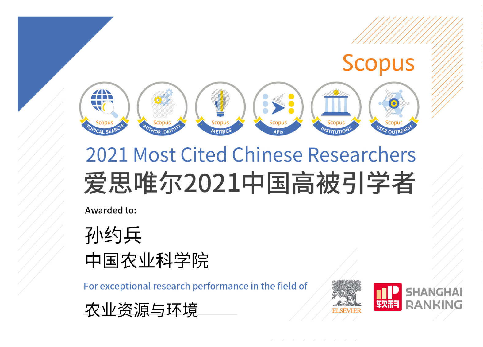 2022年4月14日,爱思唯尔(Elsevier)正式发布了2021年中国高被引学者(Highly Cited Chinese Researchers)榜单。来自523所高校、企业和科研机构的共计4701名中国学者上榜。这是孙约兵研究员连续两年入选Elsevier中国高被引学者榜单。