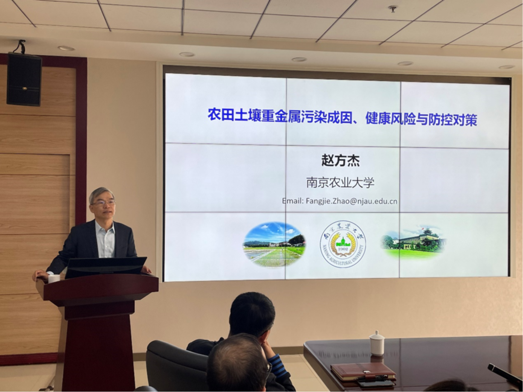 赵方杰教授以“农田土壤重金属污染成因、健康风险与防控对策”为主题作报告,简要介绍了我国农田土壤镉、砷污染溯源现状,深入剖析了南方稻米重金属含量超标原因及健康风险,并针对农田土壤重金属污染防控提出了对策建议。与会人员围绕报告主题,就我国农田土壤重金属修复发展现状、存在问题和发展趋势,以及创新团队研究方向和最新研究成果展开深入交流。