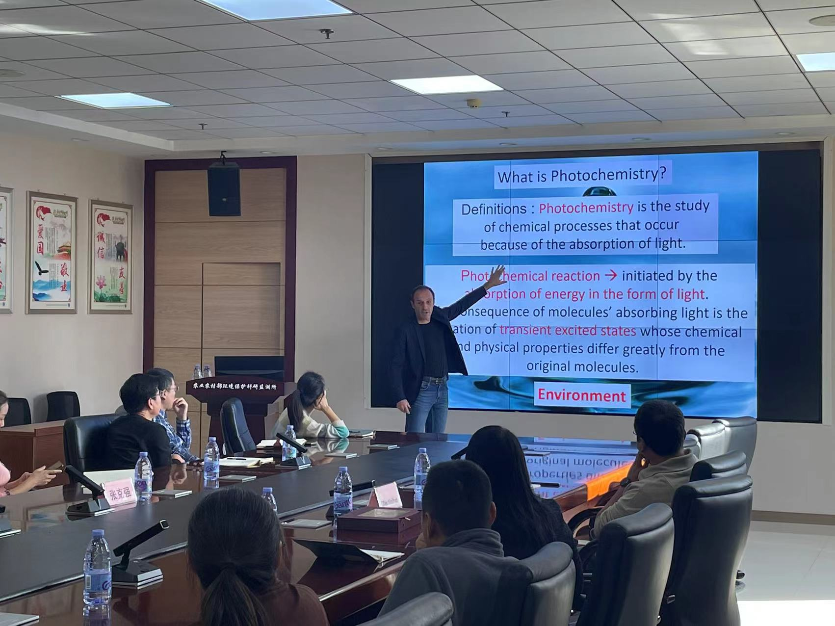 Gilles Mailhot研究员以“Environmental Photochemistry(环境光化学)”为主题,详细介绍了典型污染物受自然光照在环境中的迁转机制及其影响因素,系统介绍了自由基检测产生机理、自由基的定性定量分析,并对激光闪光光解、光量子产率测定以及电子顺磁共振波谱仪等自由基检测分析手段进行了详细介绍。与会人员结合报告主题和最新研究成果,围绕自由基对污染物影响机制的具体问题展开了深入交流。