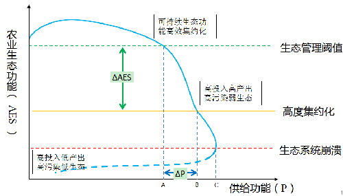 集约化农田高投入、高产出,带来了资源的高消耗、环境高污染、生态高破坏,已经直接地威胁人类健康、生存环境和农业可持续发展。长期高度集约化,高强度开发和利用,将会导致农业生态系统的崩溃。采取生态系统管理方法,科学调控和优化农业生态系统的供给功能(△P),提升农业生态功能(△AES),推进生态功能高效集约化,实现农业生态系统健康和可持续发展。