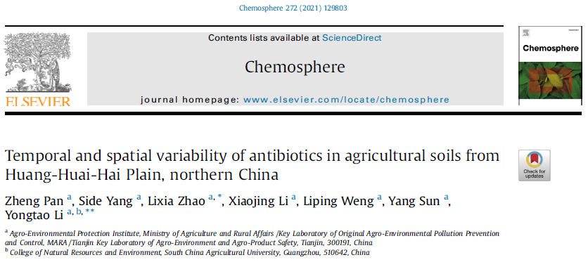 2021年,农业农村部环境保护科研监测所农田有机污染生物消减创新团队在Chemosphere杂志发表题为"Temporal and spatial variability of antibiotics in agricultural soils from Huang-Huai-Hai Plain, northern China" 的研究论文。