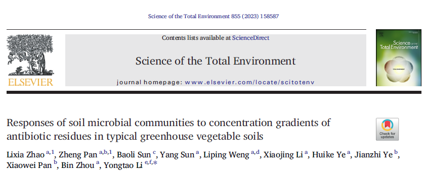 农业农村部环境保护科研监测所农田有机污染生物消减创新团队在Science of the Total Environment杂志发表题为"Responses of soil microbial communities to concentration gradients of antibiotic residues in typical greenhouse vegetable soils" 的研究论文。论文在探明天津武清设施蔬菜土壤中抗生素及其代谢产物的残留特征的基础上,揭示了自然农田环境中不同浓度抗生素残留对土壤微生物群落的响应,阐明了抗生素残留、抗生素抗性基因(ARGs)和土壤微生物群落之间的相互作用,并采用风险熵法评估了抗生素残留对土壤生态系统的潜在生态风险。研究结果将为制定土壤抗生素污染防治策略提供理论支撑。