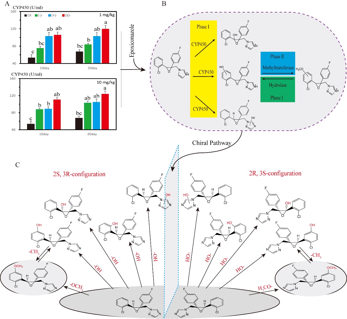 本研究利用手性色谱串联高分辨质谱和线性离子阱质谱,系统研究了手性氟环唑在土壤-蚯蚓体系中的立体选择性富集-降解-转化和酶催化作用机制。研究表明,蚯蚓体能够优先富集2S,3R-(-)-氟环唑。通过质谱解析手段发现并鉴定氟环唑的5个转化产物(TP),其中环氧环Ⅰ相羟基化TP和甲氧基化Ⅱ相TP为首次报道。并对5种TP成功实现手性分离,并发现其在不同的基质中存在不同的显著的对映选择性。CYP450单加氧酶和手性TP的对映选择性差异进一步解释了氟环唑在系统中的对映体生物转化机制。本研究为手性农药的风险评估和在农田土壤中的消减控制提供了技术支撑。