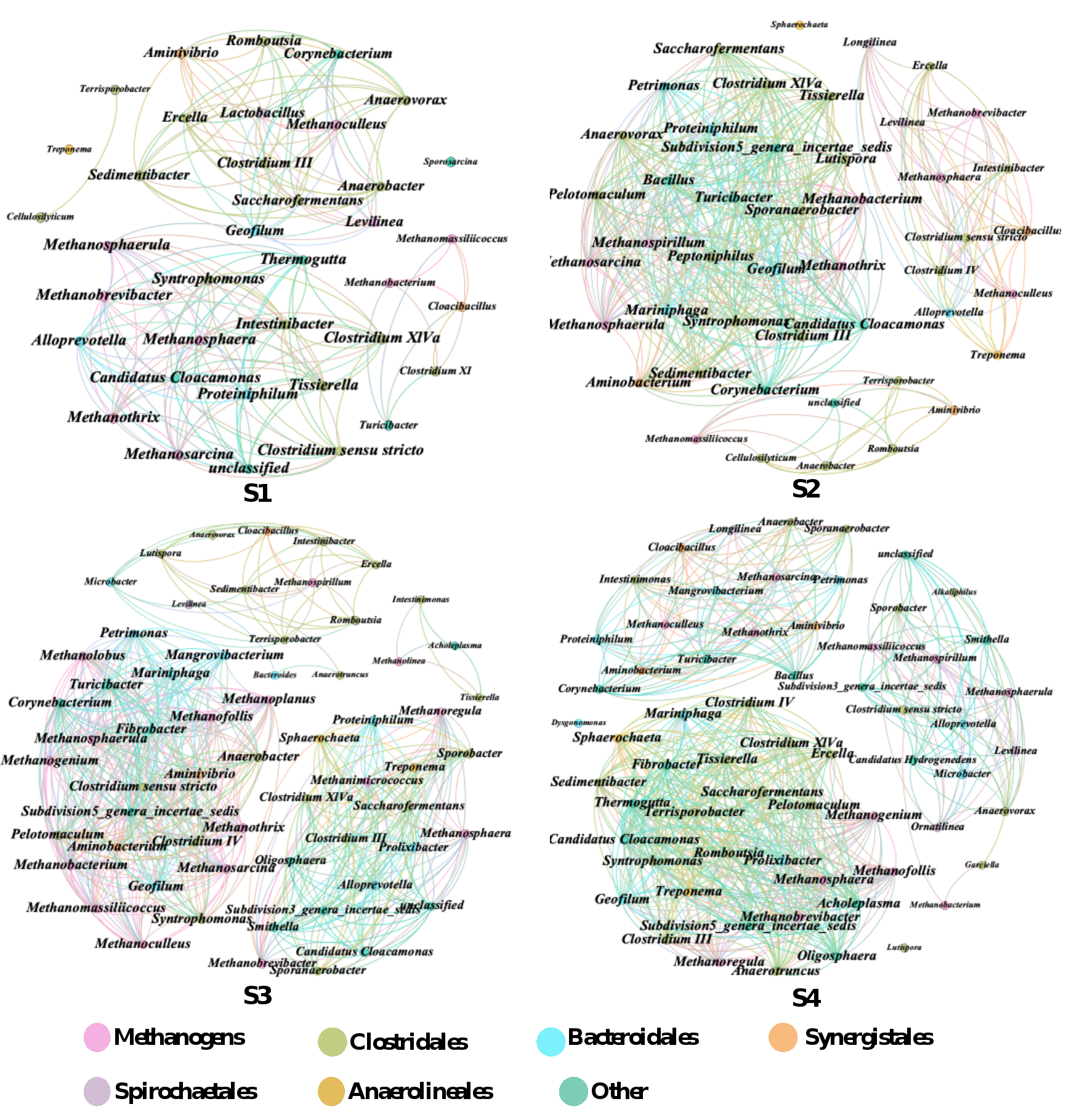 2. 通过网络分析评估所有底物层样品中平均相对丰度>0.1%的产甲烷菌和细菌之间的关联:S1S2S3S4分别代表第13334578天底物层中微生物群落之间的互作作用
